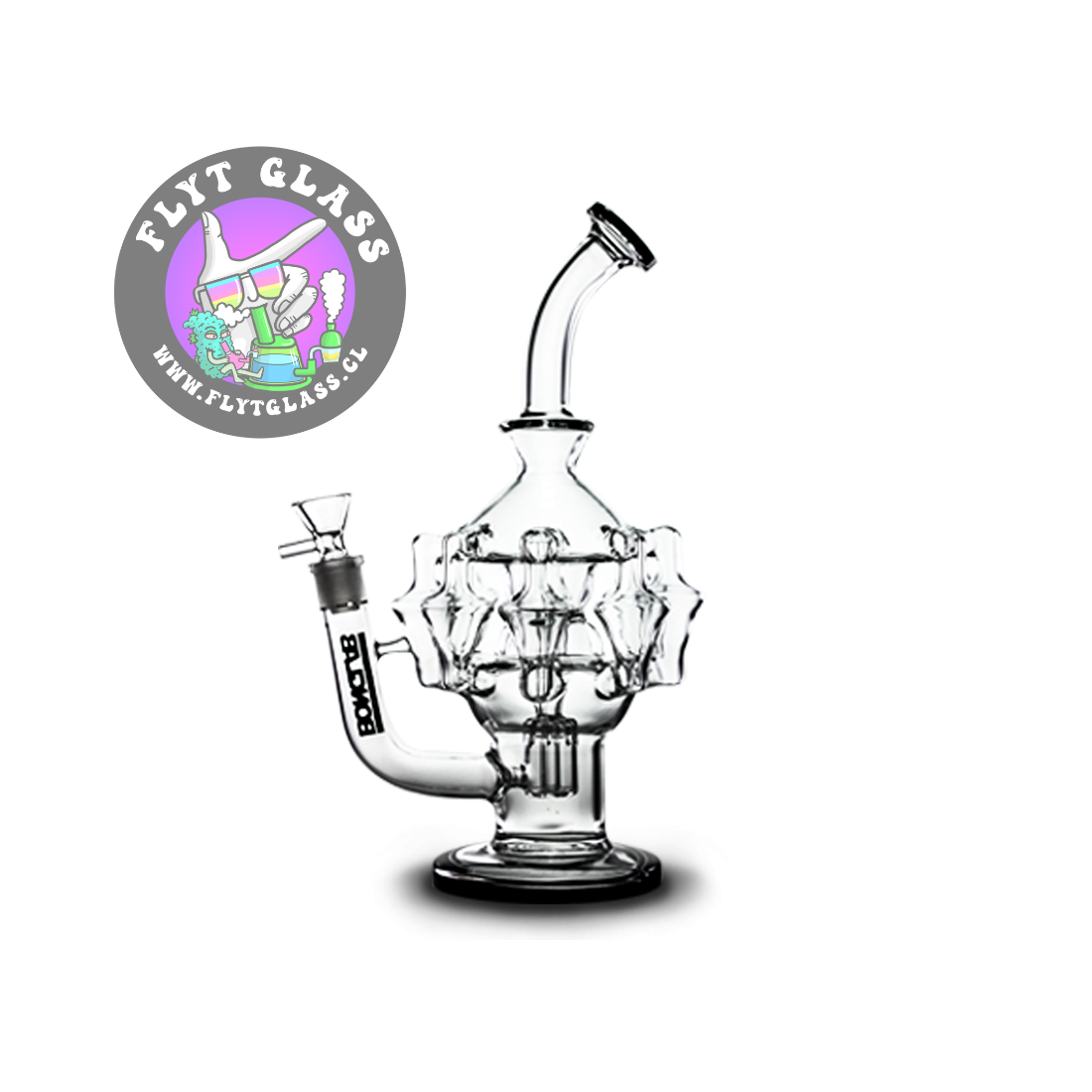 Este implemento viene con un quemador de 14mm para hierba seca, que se inserta en un difusor integrado que conecta con una base percoladora tubular. El segundo proceso de filtrado se efectúa a través de ocho brazos percoladores, que suavizan el humo que asciende hasta la boquilla curva.